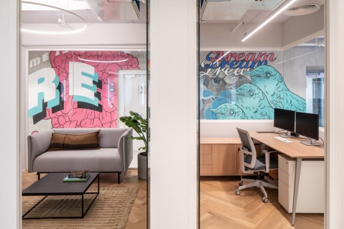 鲜艳的色彩和大而大胆的艺术品打破了传统的办公室外观,提供了时尚的触感,突出了更传统办公空间的吸引力。社区空间的设计旨在提供极致的舒适感,精心挑选的家具营造出积极的工作环境。植物被精心放置在整个空间中,营造出一种开放感,并鼓励同事之间的协作和透明。#公司办公空间设计装修#