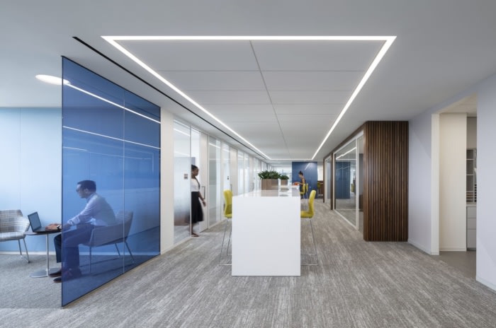 为了营造一种平静和专注的氛围,企业倾向于简洁的线条和冷色调,并在整个色调中流行色彩。落地窗为整个公共区域和会议室提供充足的自然光线,可直接欣赏国会大厦和更广泛的 DC 天际线。通过内置搁板、公共长椅座位和彩色玻璃墙创造了发现和互动的时刻,在员工和访客在整个办公室中移动时与他们互动。#办公室装修设计公司#