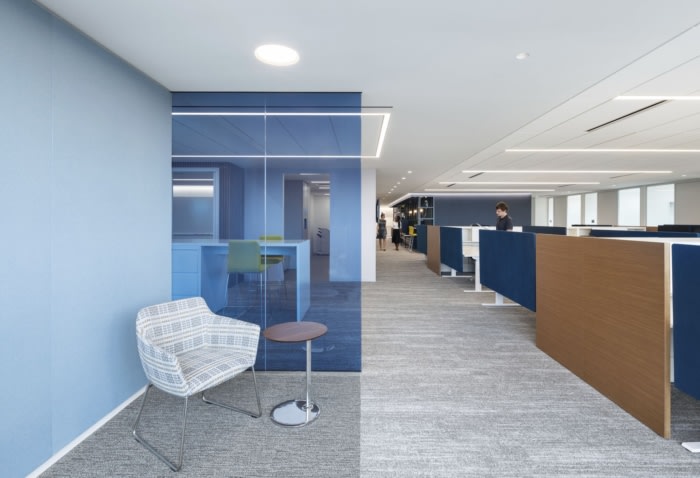 建筑体量充当视觉和声学缓冲区,在协作和独立工作空间之间创建平滑过渡。该办公室旨在适应各种工作方式,包括私人办公室、专用工作站和焦点室的组合。选择更显眼、更温馨的办公桌而不是隔间,使企业的员工能够在互动和专注的个人工作之间取得平衡。#办公室装修设计案例#
