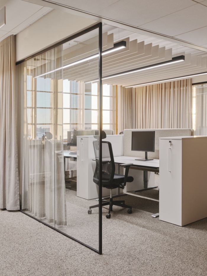 原始材料,如玻璃墙和门,以及大量现有材料,如吊顶,都得到了最大程度的保留。现代木制家具和永恒的设计经典,空间体现了北欧的氛围和尊严??砝纳钌局时砻娣从沉松目释瘴АI杓朴镅杂虢ㄖ睦方ㄖ嗤?,家具、声学解决方案和结构旨在使开放式办公空间平静下来。#广州办公室设计公司#
