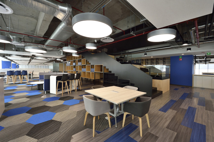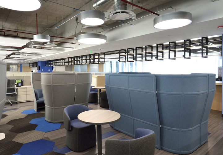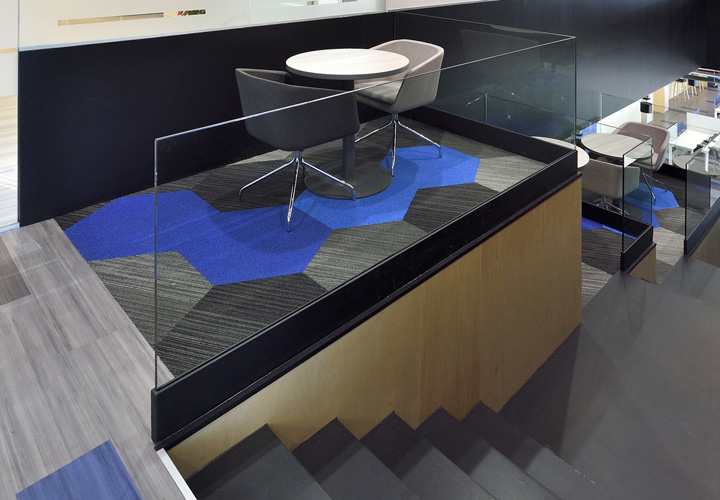 它位于墨西哥的中心,是个保险公司,分享它的办公楼装修效果吧,整体感非常有美感。设计师用到了横贯建筑的钢结构造型,裸露的顶面构造便于后续的维护,地面用LVT石塑地板,大部分区域还是用地毯覆盖,大量几何图形元素出现在脚下,订做的地毯和色彩接近的家具形成一幅完整的画面,这些图形像从远处飞来的灵感之石,降落在写字楼里。