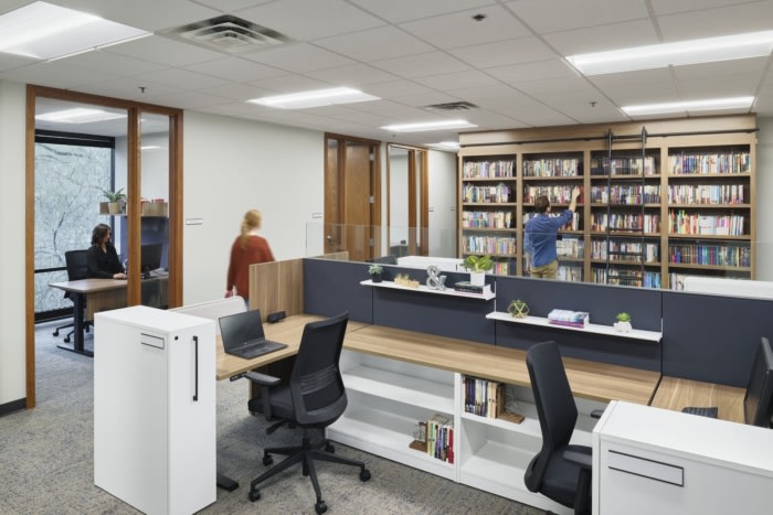 大堂的书柜和开放式办公区是这个独特空间的突出特点。从上到下充满了贝克出版集团及其出版合作伙伴出版的书籍,散发着宏伟的魅力。这些书柜不仅吸引最终用户从书架上拿起一本小说,蜷缩在壁炉旁的舒适椅子上阅读引人入胜的书。#广州办公室设计装修公司#
