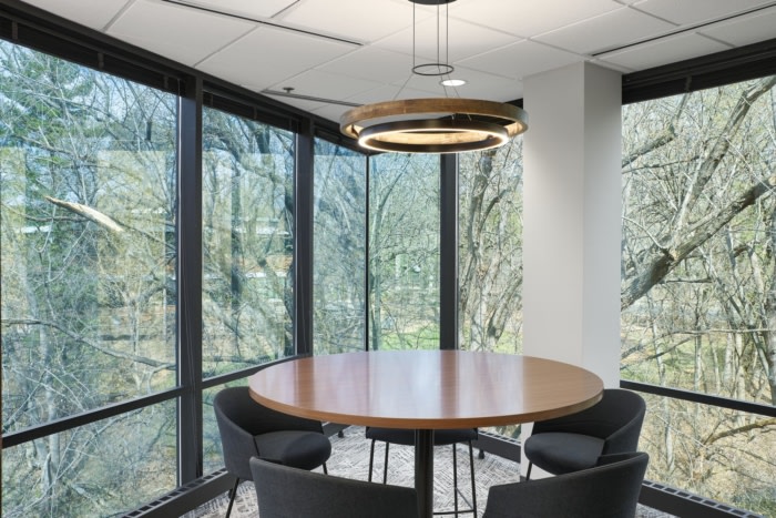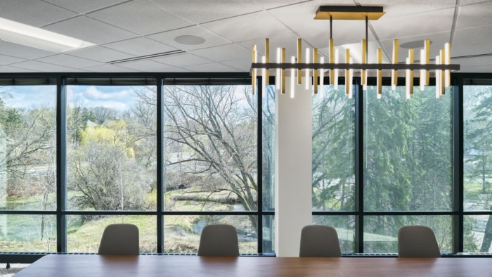 利用建筑周围风景如画的树木繁茂的景观和沼泽地,会议室、休息室和私人办公室被故意放置在窗户上。这些战略性的布置不仅提供了令人叹为观止的自然景观,而且还在会议和午休时间唤起了一种宁静的感觉,并为审稿的编辑提供了一个宁静的环境。外部环境的影响也延伸到内部美学。柔和的大地色调被精心融入家具和饰面选择中,反映了窗外繁荣自然景观的宁静本质。#办公室设计装修#