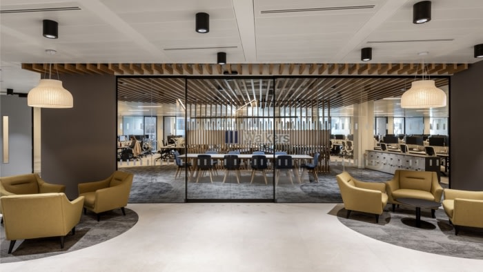 当员工进入主办公区时,迎接他们的是一个令人印象深刻的木板条品牌入口点,带有软垫座椅和两侧的大桌子,非常适合非正式会议和触地工作。整个空间都采用柔和的调色板,以保持专业而现代的感觉,利用其品牌标志性的蓝色色调,与他们的业务相得益彰。#办公空间设计案例#