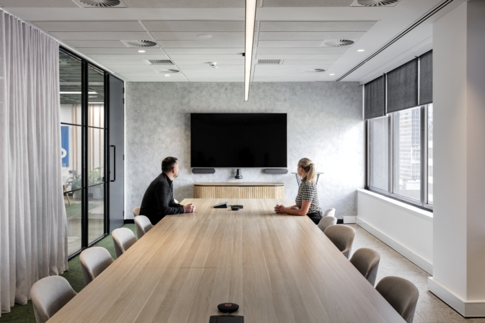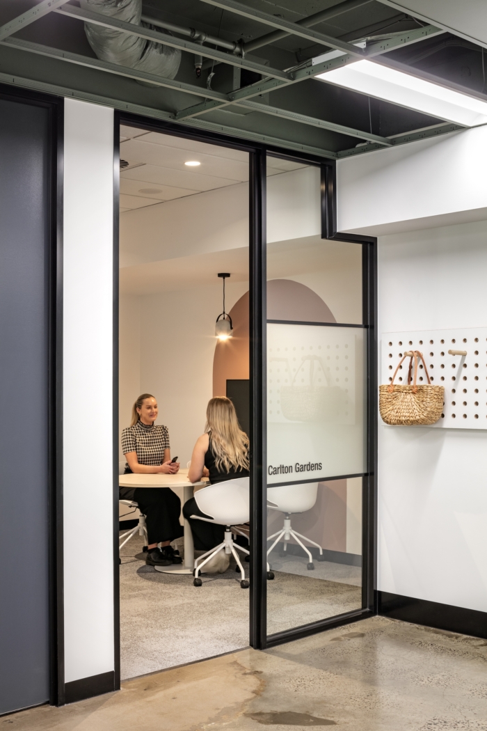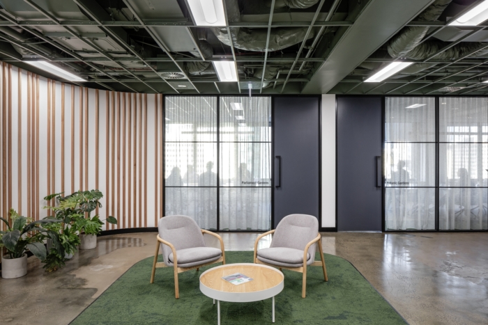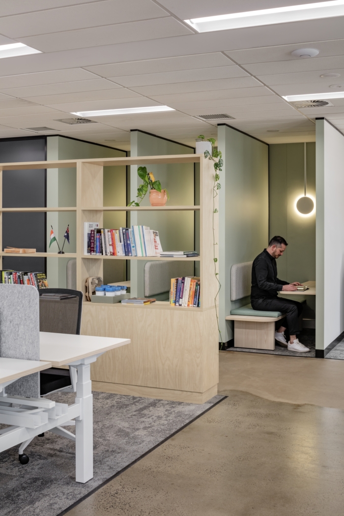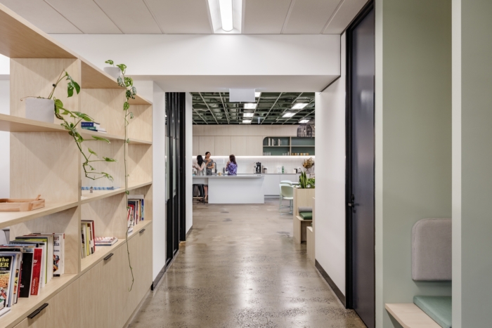 整个空间鼓励丰富的森林般的绿色植物 - 设计使用了自然元素和当代美学的和谐融合。胶合板木材照亮了空间,带来了温暖,裸露的混凝土有助于纹理差异,而鼠尾草色调和淡朱红色的口音则重申了与自然的联系。#办公室装修案例#