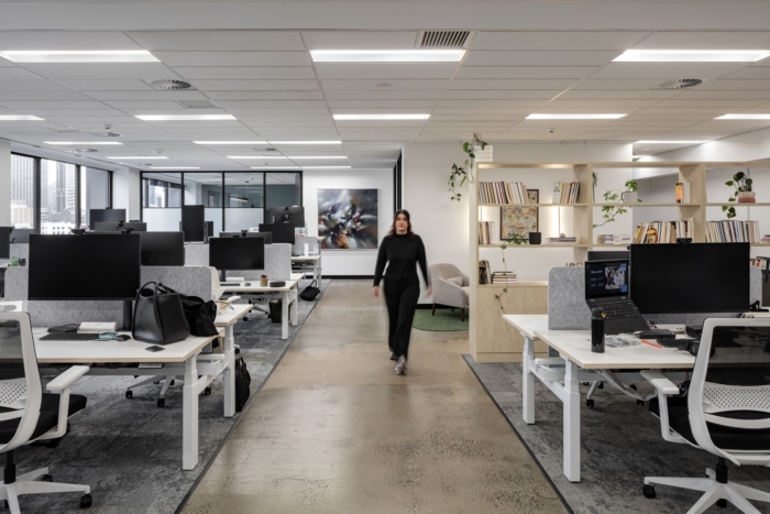 客户拥有广泛的折衷艺术品集体。设计概要的一部分是将这些作品作为特色融入空间——带来色彩、纹理和个性。部分高度的图书馆书架系统排列在走廊上 - 旨在在不减少光线流动的情况下划分空间,并鼓励员工拿起一本书。SPP项目的核心是动态突破区。这个宽敞的区域旨在成为办公室的员工中心,拥有设备齐全的厨房和各种座位风格(长椅、餐厅和展位座位)。#公司办公室装修案例#