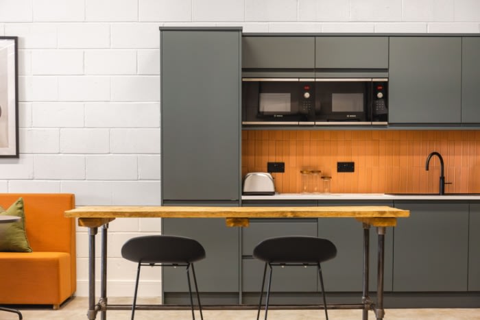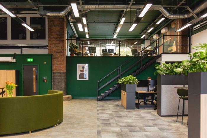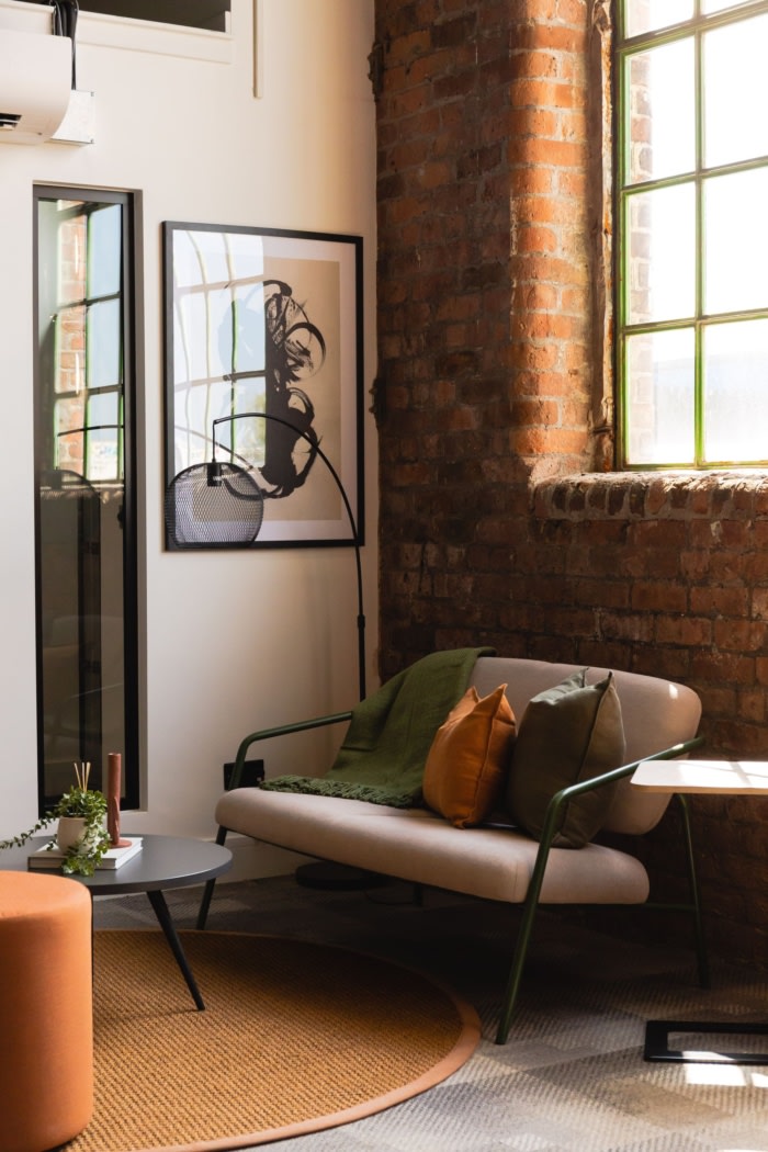 设计团队在令人惊叹的工业磨坊中找到了丰富的灵感,该磨坊拥有裸露的砖柱和宽敞的拱形窗户。落地窗装饰着迷人的绿色钢框架,是设计方案叙事和调色板的基础。通过用自然、朴实的色调补充绿色工业结构,实现了和谐的平衡,从而产生了舒适、温馨和温馨的室内空间。#办公室装修设计#
