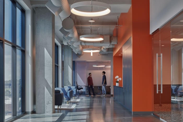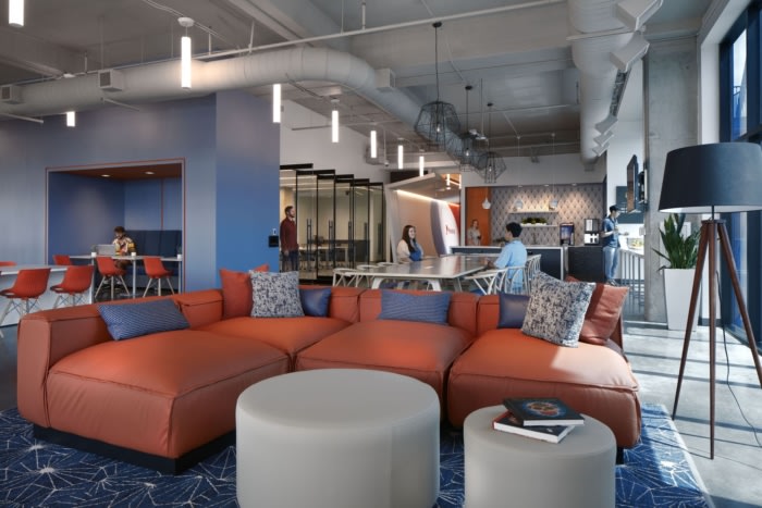 当员工和客人进入空间时,他们发现自己被倾斜的形式和吸音材料所包围,旨在创造一种声学剥夺的体验。大胆的色彩和对数图案的使用捕捉了反映公司以人为本的技术的能量和品牌。#办公空间设计公司#