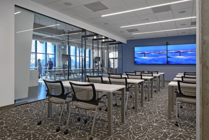 以通过重新构想的办公体验更好地支持其新的混合工作政策。与之前的位置相比,新空间的大部分是灵活的、未分配的工作环境,支持各种活动和社交活动。主要的中央咖啡厅和大型户外露台为专注和共享工作提供了独特的选择,并享有城市天际线的壮丽景色。#办公空间设计#