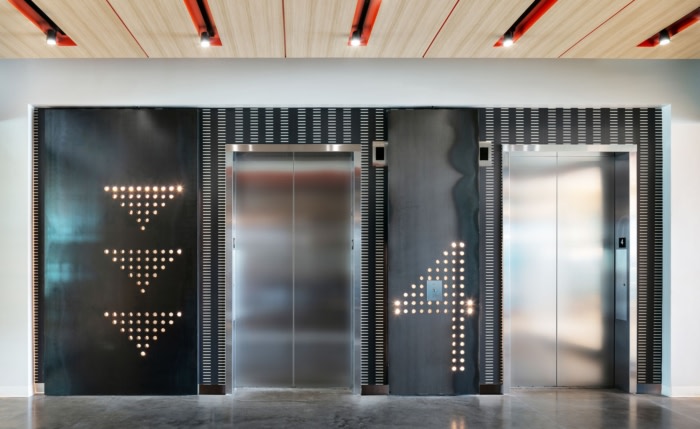 允许员工个性化空间的设计元素被精心分散在办公室周围。接待墙两侧有一个定制的钉板,通常用于欢迎新员工、庆祝生日或允许员工互相留言。#办公室设计装修广州#
