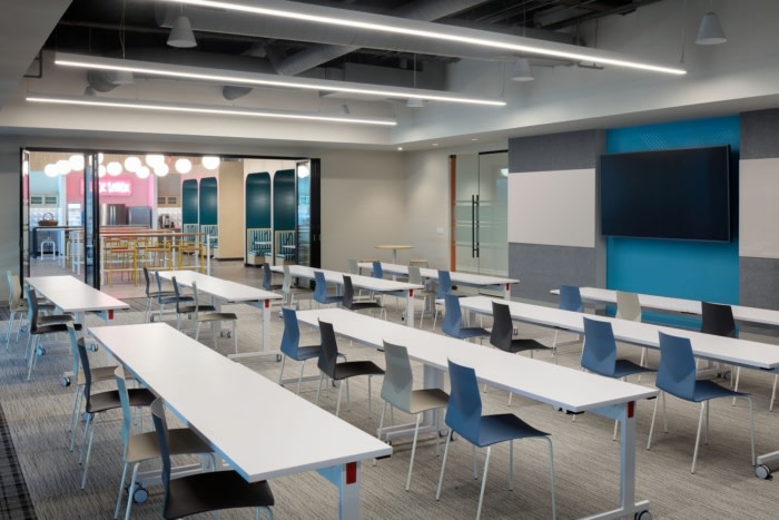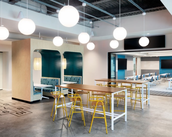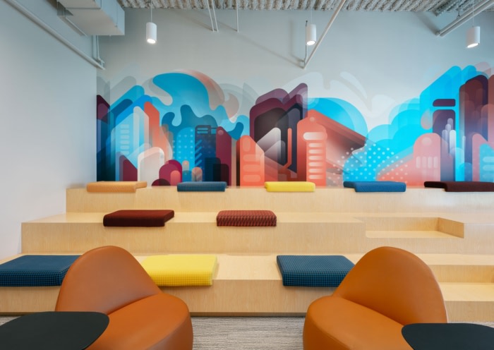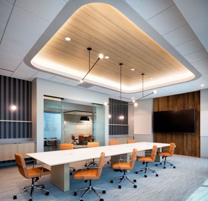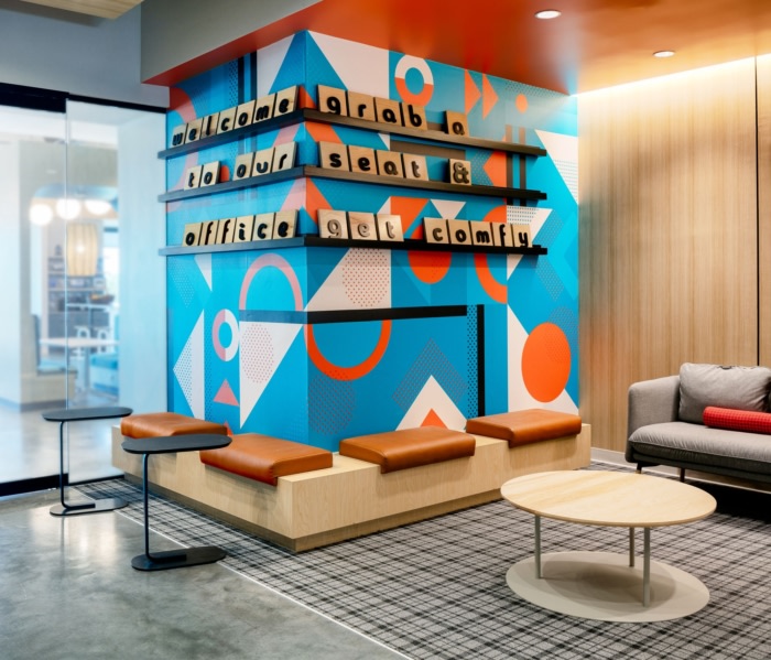 会议室和公共空间的家具选择成为该概念的另一个据点。50% 的会议室配有组合椅和躺椅,为员工提供以反映自己家舒适风格的工作选择。内置隔间作为咖啡厅和接待处之间的分隔,为员工提供了额外的软座会议区。#办公室设计装修#