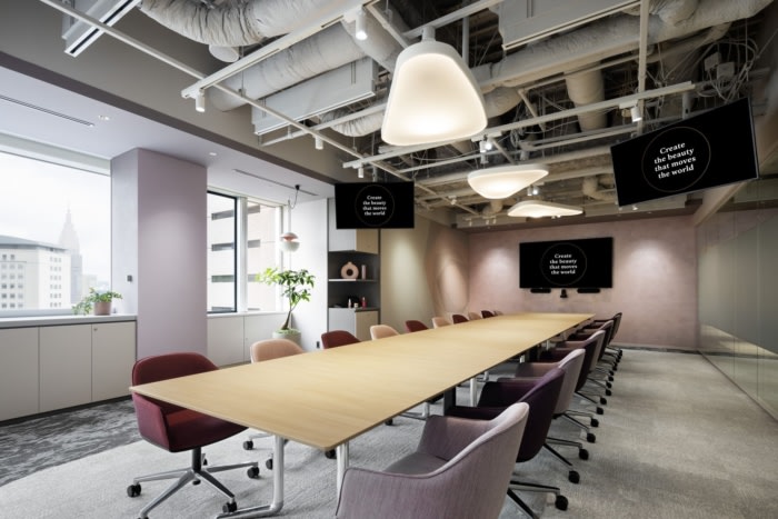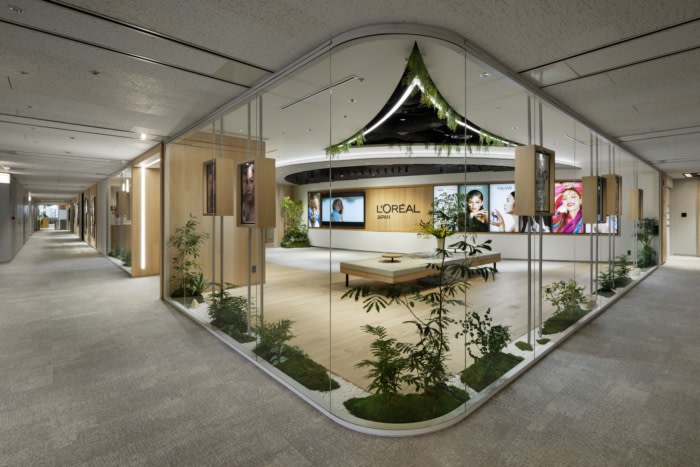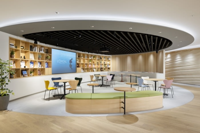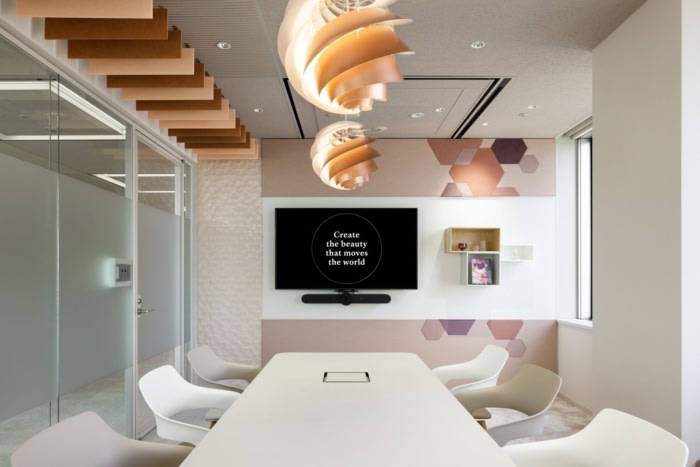 该设计通过四个季节的主题融合了日本的美丽,纹理,家具和装饰都注入了日本工艺。办公室注重灯光、声学和材料等细节。它创造性地重新利用日本欧莱雅K.K.的产品,如眼影、粉底和口红,将它们转化为油漆、灯罩和瓷砖,而不是处理它们。考虑到员工的福祉,室内绿化和可调光LED照明也得到了实施。#办公室装修设计#
