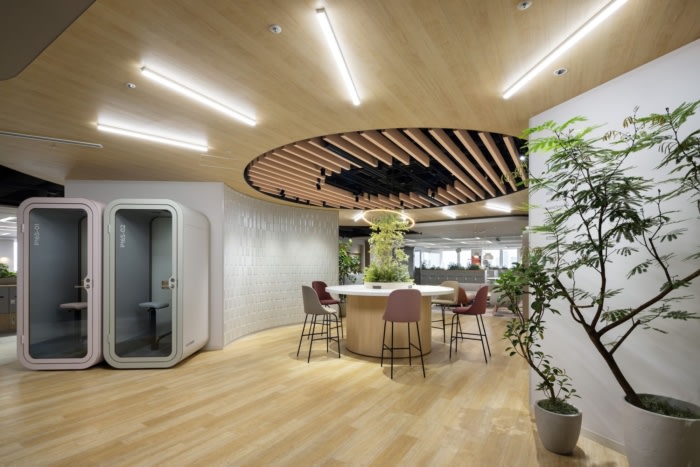 该办公室还采用了基于活动的工作,以实现强调员工独立性和多样性的新工作方式,以混合工作为主要前提,并安排适合每项工作的工作空间以提高生产力和效率。还新设立了直播专用房间,以满足数字时代的需求。该办公室旨在改善可用空间内的流通,并创造一个无障碍连接的开放环境,从而实现协作和人际联系的机制。#办公室装修设计案例#