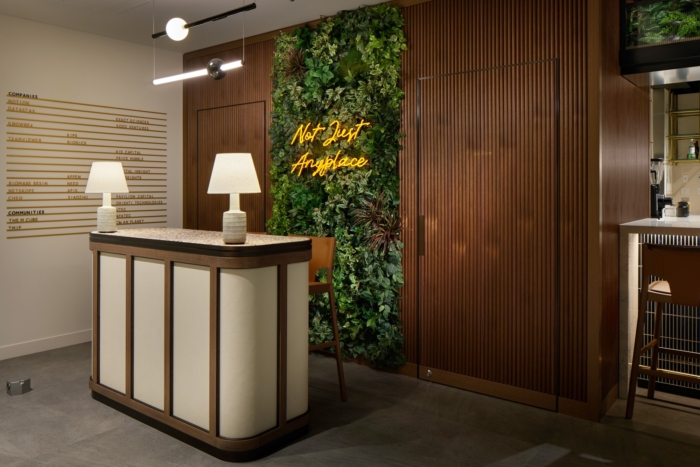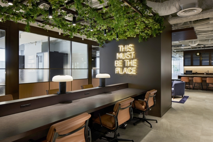 整体设计以热情好客为主,精致而轻松,暖色调和灯光营造出居家和舒适的感觉。不同的纹理提供真实性,融合了原始和温暖的饰面,并专注于与自然相呼应的元素设计,以种植绿色植物和聚集的火焰为特色?;厥詹牧显谡錾杓乒讨幸恢笔褂么葱?。Foresso是一种从木材废料中提取的材料,被纳入接待台,而贝壳废料已被整合到厨房设计中,会议隔间使用了由回收塑料瓶制成的隔音板。#广州办公室装修公司哪家强#