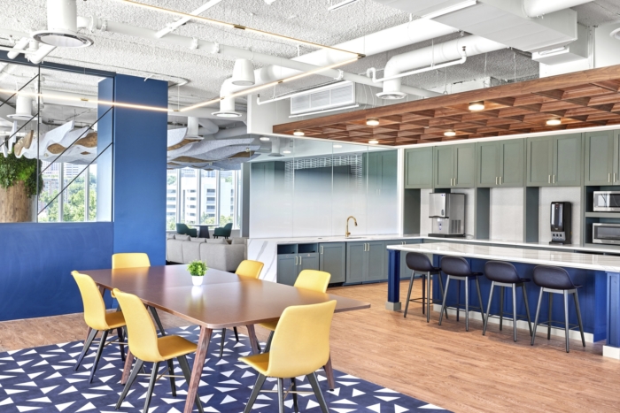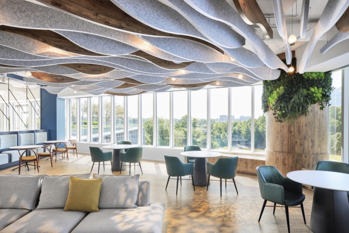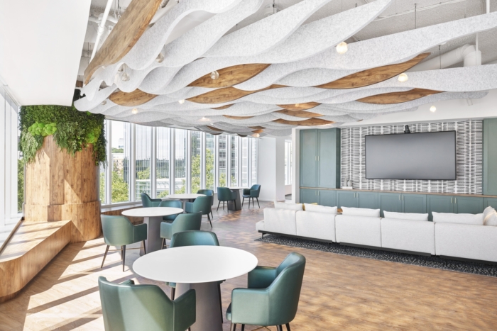 为了满足员工在大流行后办公环境中的愿望,该设计力求通过热情好客、关键品牌元素、自然融合和灵活的工作空间来创造一个引人入胜和温馨的空间。俱乐部会所展示了热情好客的元素,设有图案地板、镶板木制品、格子天花板和定制的弯曲长椅。会所和咖啡厅通向大型户外露台,适合工作和社交聚会,营造出理想的室内/室外工作环境。咖啡厅为员工提供小吃,如美味咖啡和冷冻酸奶吧,配有装满谷物和其他甜味配料的分配器。#办公室空间设计公司#
