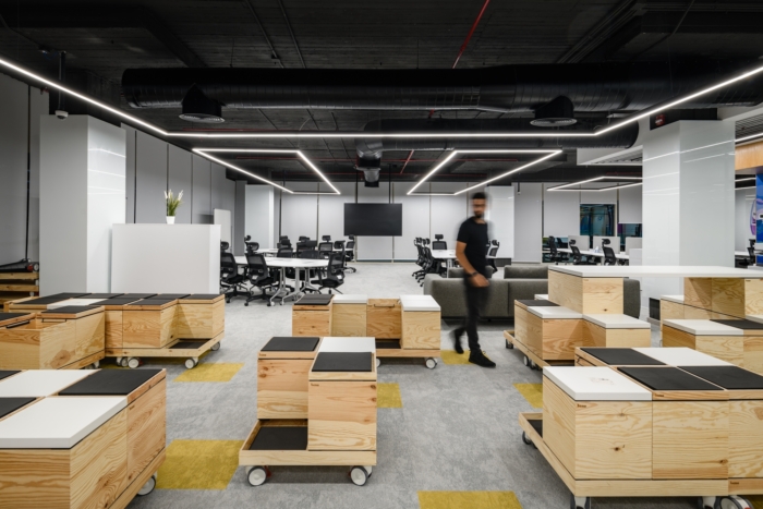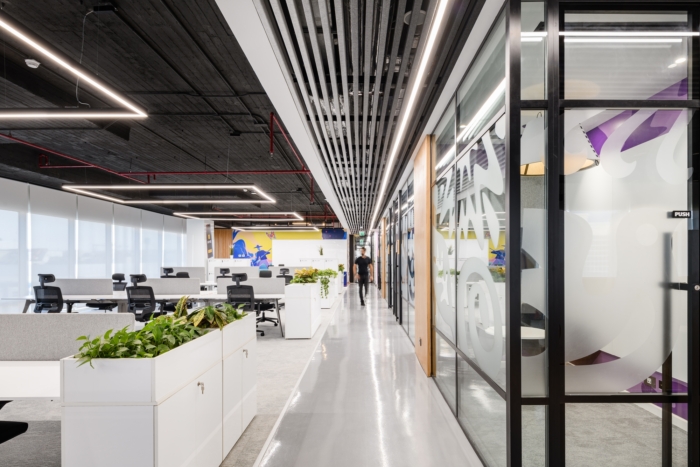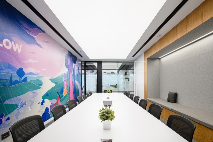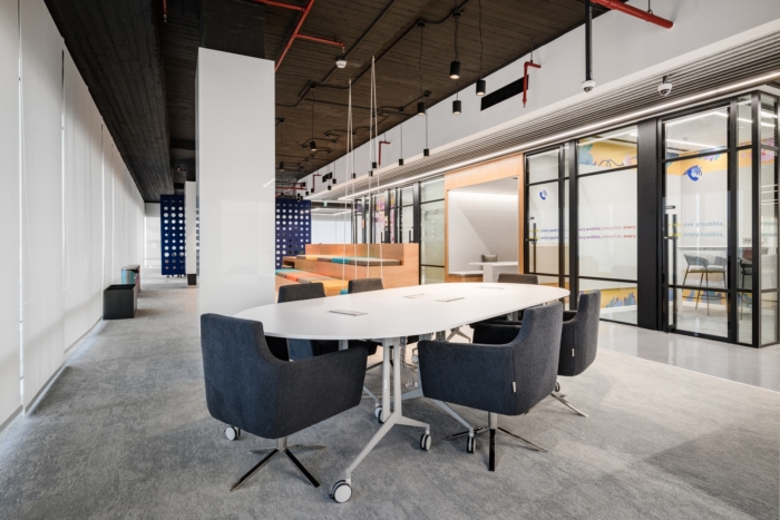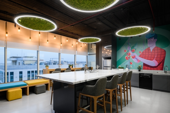 办公室中的照明设备在突出不同区域并赋予每个空间独特的身份方面发挥着重要作用。例如,食品储藏室设有飞蛾吊坠,而主接待区则装饰着金色圆形吊坠,为入口增添了一丝奢华感。#公司办公室装修设计案例#