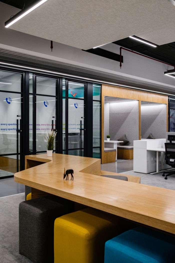 空间的墙壁上装饰着3D打印的海报,展示了联合利华的包容性理念和原则,特别是在女性赋权方面。新的品牌在整个空间中占据突出位置,柱子被用作覆盖地板的书写表面。#公司办公室装修设计#