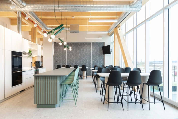 新办公室享有圣劳伦斯河的壮丽景色。公共空间和开放式分区围绕景观设计,允许最大的光线穿透项目中心。厨房和户外露台面向河流,享有壮丽的全景。从厨房的三角形陶瓷,到咖啡馆区的方形网格,再到玻璃立方体窗户的翠绿色,每一个细节都丰富了体验。设计师明智地整合了与总承包商日常生活有关的元素,创造了一幅建筑头盔和定制壁纸的壁画。#办公室设计装修#