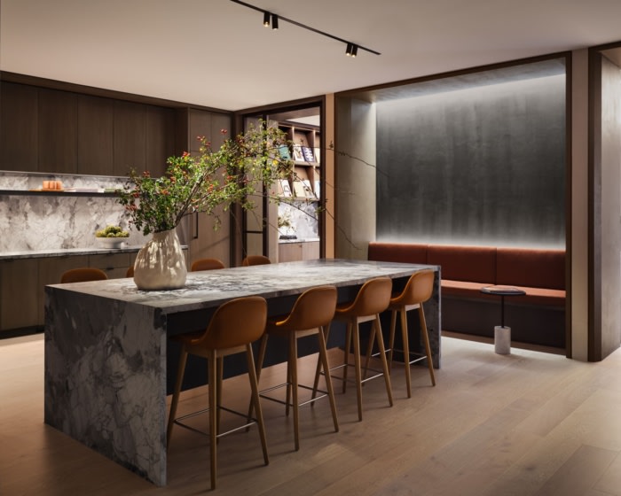 通过分层温暖、天然的材料——即石灰水洗彩绘墙壁、蜡烛灰橡木制品和白橡木板地板——设计师创造了一种高度策划但微妙的方法,并通过可调节的照明得到增强。触感柔软的材料调色板和精心微妙的照明水平营造出宁静的工作环境,作为远离周围城市的喘息之所。#广州办公室设计装修公司#