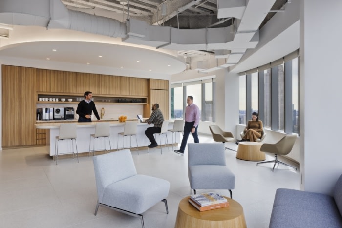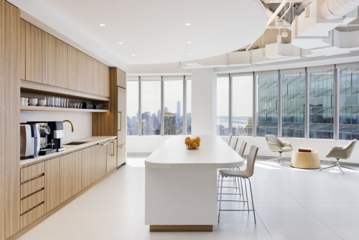 将天花板暴露在外以获得工业感,但涂成白色以获得精致感。这些设计选择的深思熟虑的整合最终融合了酒店和工作,创造了一个毫不费力地将酒店环境的温馨氛围与生产性工作所需的功能效率融为一体的环境。毗邻迎宾区的是一亭会议室和电话室,由接待处附近的开放式休息室和另一端的储藏室和餐厅组成。展馆营造出弯曲的效果,引导客人穿过办公室,到达俯瞰时代广场的关键聚会空间。#公司办公室设计案例#
