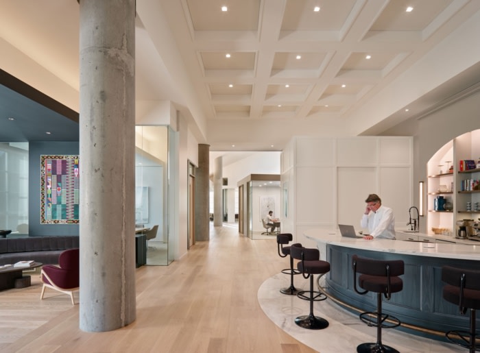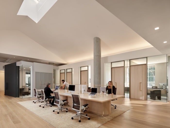 木材和大理石与宝石色调相得益彰。拱形门口是通往绿色房间的喜怒无常的入口,这是一个镶板和令人垂涎的安静空间,用于私人讨论。在私人办公室和公共工作空间所在的位置,设计团队暴露了25英尺高的开放式办公室体量,天窗沿着光秃秃的斜屋顶延伸。没有一个可见的灯具,但房间的灯光却很漂亮。#办公室装修公司哪家强#