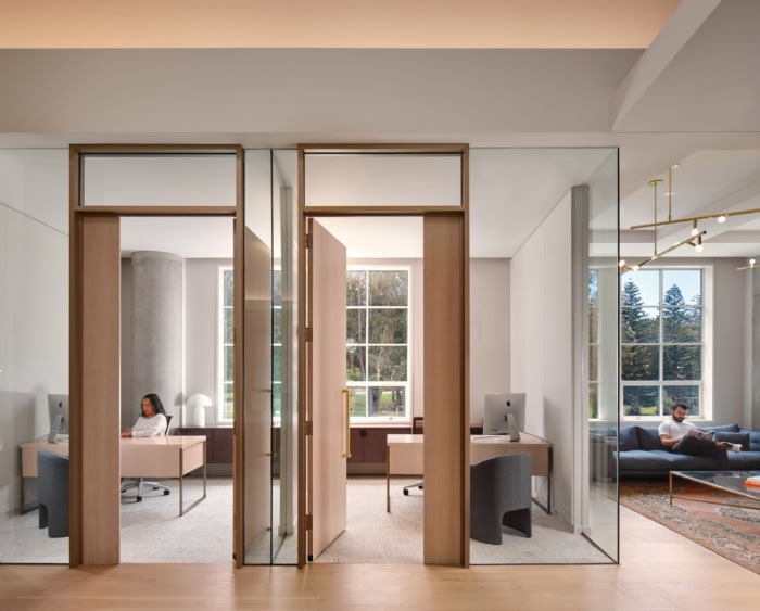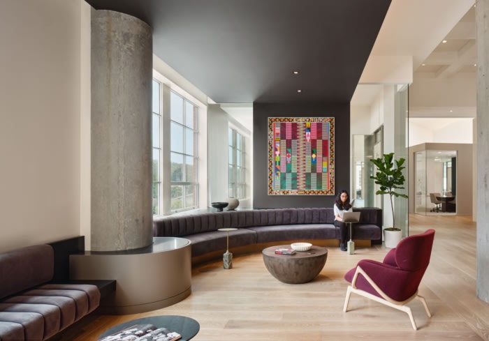 优雅的新金库将目光向上吸引,是对永恒而历史悠久的旧金山建筑的致敬。但是,设计团队没有使用传统的沉重而昂贵的木制品,而是使用轻质石膏板和拉伸织物巧妙地创造了吸音率高75-85%但视觉上无法区分的金库。在整个空间中,古典和永恒的形式和特征与现代口音相平衡。#办公室装修公司#