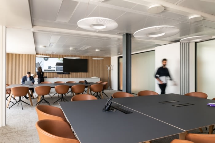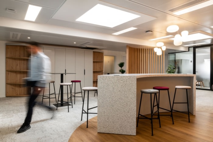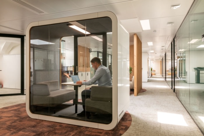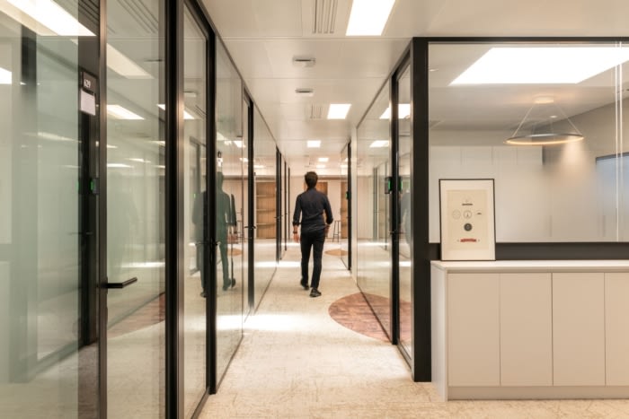 该项目的特点是不同类型的办公室分布均匀:开放和协作空间,如会议室、休息区、茶室和自助餐厅,与封闭的办公室、会议室和专用于机密事务的私人区域很好地混合在一起,以促进各级协作,创造一个旨在促进团队合作的空间, 隐私和功能。#高端办公室设计装修风格#