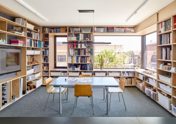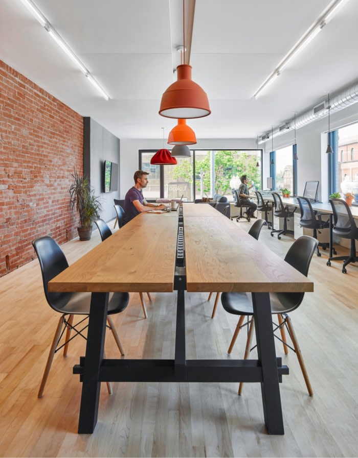 内部细节与建筑外观一样重要。斯堪的纳维亚风格的天然材料调色板由裸露的砖、枫木地板、波罗的海桦木板条和木制品组成,永恒、纹理和温暖,与炭灰色门和家具等深色口音形成鲜明对比。接待处的白色可丽耐瀑布面板以刻有“你好”的字样迎接游客,墙壁和天花板安装的生态毡面板提供声学效果。当地设计师和制造商的工作被尽可能多地纳入该项目:灯具、家具、工作站和纺织品等。#办公室设计装修报价#