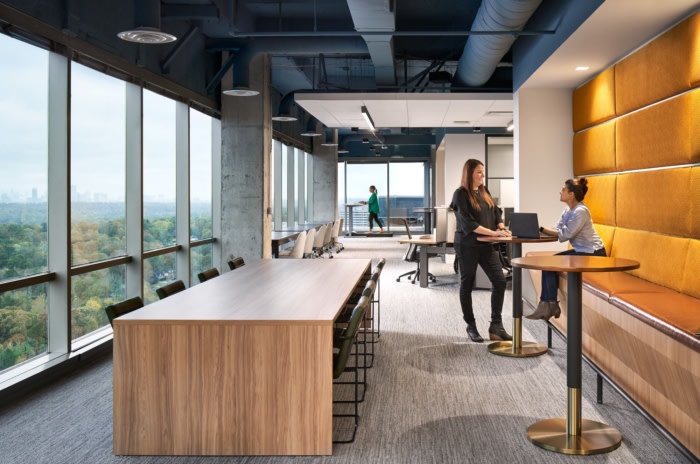 为了加强对友情和文化的渴望,超过四分之一的面积专门用于社交中心,为不同的协作风格引入各种座位选择,连接社交中心与主要会议和培训区的楼梯?;嵋楹团嘌登诩际醴矫嫱度肓舜罅孔式?,因此远程工作的人仍然感到联系紧密。#办公室设计装修#