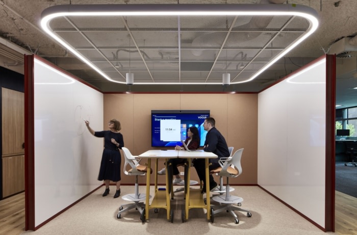 设计美学故意与现代低调和中性方法的概念相矛盾。工作场所生动而充满活力,突出了色彩、质感和体积。电蓝色楼梯在连接地板的同时充当视觉中心,促进运动和互动。#办公楼装修设计案例#