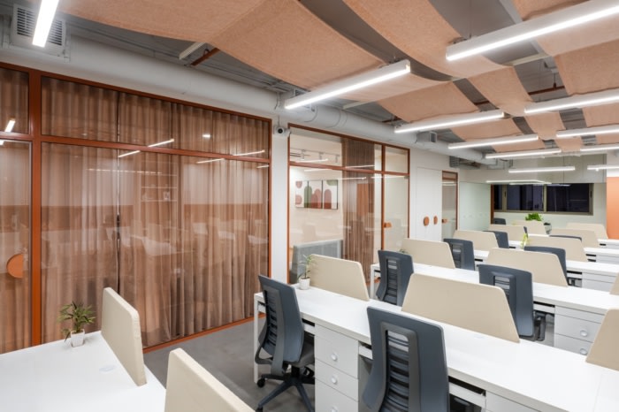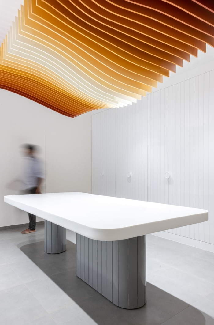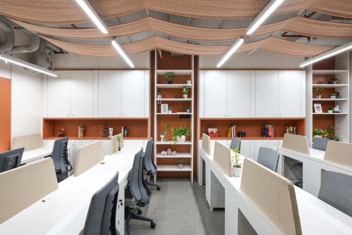 彩色织物被创造性地用于工作区的天花板,形成松散的悬挂补丁,为空间增添流动性。每个补丁都经过精心悬挂,创造了一个有机的安排,促进了团结和团结。为了解决有限的自然光问题,设计师采用了反光白色配色方案,最大限度地提高了照明。周到的空间规划将存储单元与现有柱子集成在一起,确保功能性,并有助于营造开放通风的氛围,使设计元素大放异彩。#办公室装修#