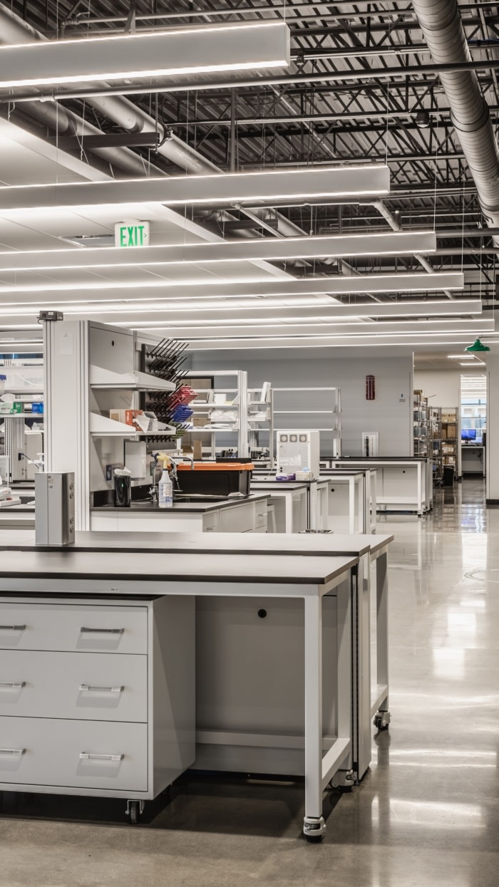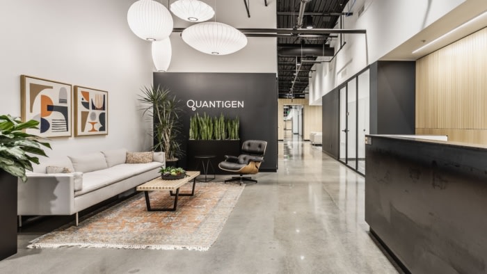 实验室空间由大面积的玻璃、开放的长凳区、色彩缤纷的墙布以及天花板处理和线性照明的俏皮重叠来定义。#时尚办公室装修设计案例#