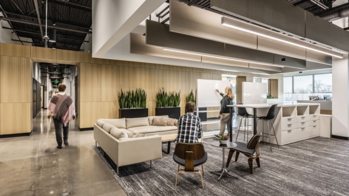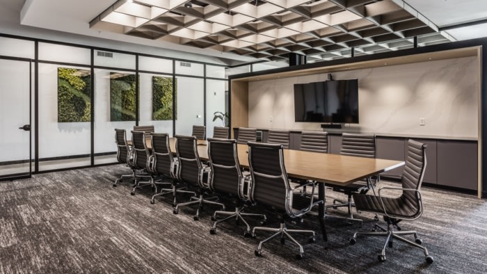 办公室装修设计:毛毡天花板处理增加了温暖和额外的视觉趣味
