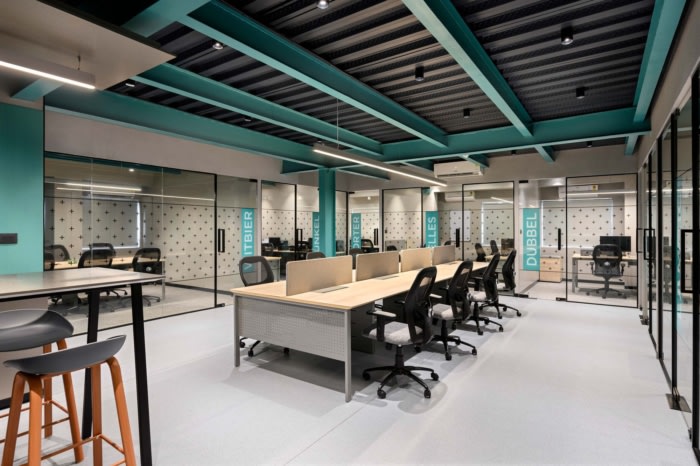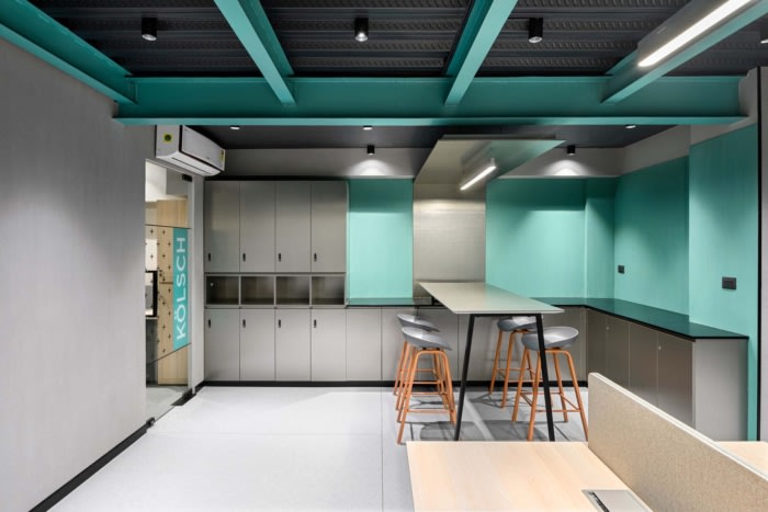 联合办公空间由客户在商业建筑的露台区域使用钢框架组成。与其用干净的饰面封闭现有的天花板,不如决定用油漆饰面保留结构的原始饰面,以创造一种工业而现代的外观,增强建筑的高科技风格。为了注入活力,选择了蓝绿色的色调,并辅以整个室内的灰色和木材色调。通过以各种啤酒命名较小的房间,引入了一丝创造力,象征着在轻松愉快的氛围中将个人聚集在一起的想法。#办公空间设计装修公司#