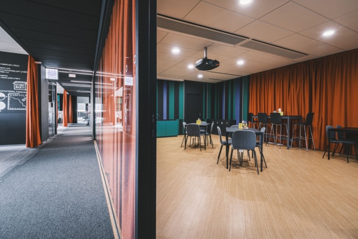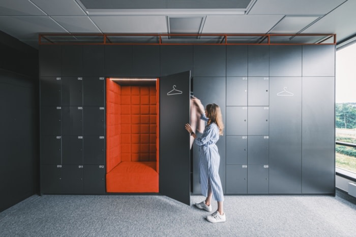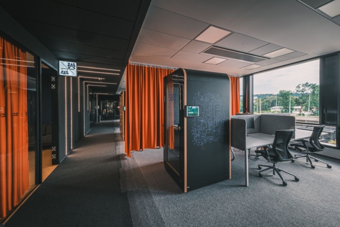 办公室的整体氛围平静,没有过于明亮和分散注意力的地方,以保持员工的注意力。有模块化家具,软蒲团和隔音电话亭。然而,在会议室中,故事主角的存在是通过鲜艳饱和的色彩、不同纹理的组合和独特的照明元素来表达的。纺织窗帘既是办公室不同区域之间的装饰元素,也是视觉分隔器。它们为空间提供了变革性的影响,并且织物具有良好的声学特性。#广州办公室空间设计公司#