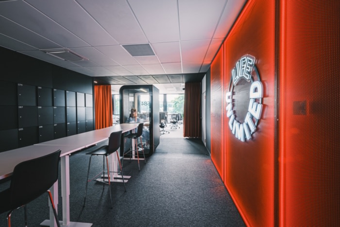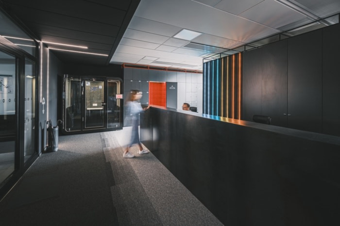 工作空间的概念围绕着现代和简约的设计,融合了大胆的色彩、霓虹灯和金属表面。设计团队开发了一个完整的故事,以闪电般的战士形象为中心,作为室内构图的主要主题。对关键角色的引用在主要通信区域中被加密,他的存在体现在照明元素中。熟练的战士的旅程从接待区开始。#办公室空间设计公司#
