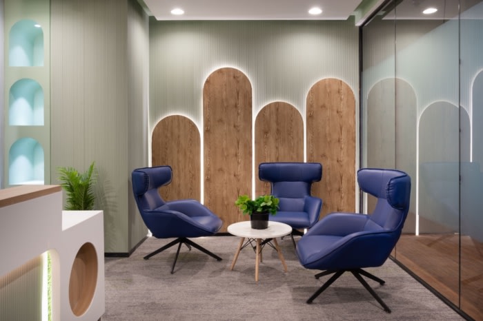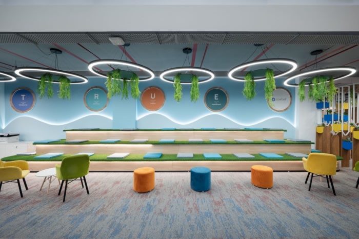 为了满足客户对年轻办公室设计的愿景,设计师以阶梯式坐姿创建了一个充满活力的协作区。这种布局鼓励员工之间的互动和构思,为头脑风暴和非正式讨论提供了一个动态空间。#公司办公室设计装修#
