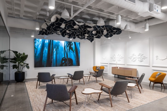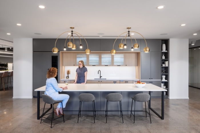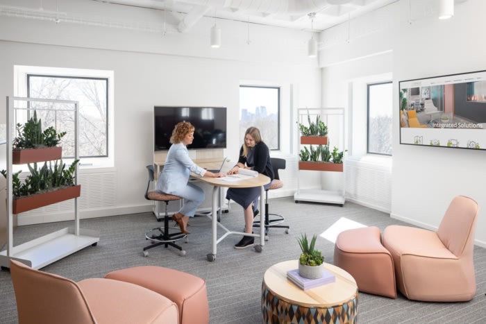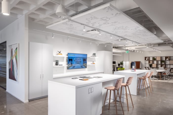 当客人到达时,前台是一个明亮开放的欢迎中心,包括陈列室接待处、充满活力的休息室和教育区以及相邻的热情好客风格的储藏室以及舒适的半隐藏炉边聊天区。这些规划空间中的每一个都提供了参与和互动的机会,从设计界的客户介绍和研讨会到合作谈判和协作设计师接触点。这些前台设施的主要前提是易于流动和极致的灵活性,允许客人、访客和队友根据场合相互联系。#专业办公室装修设计案例#