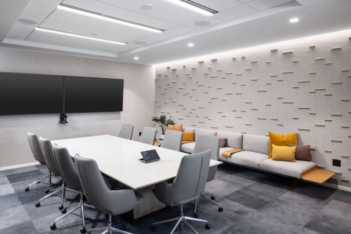 沿着前台和陈列室“舞台”的每个窗户都让员工和客人可以欣赏到外面平静的森林景观。设计团队还利用了建筑独特的混凝土华夫饼天花板,突出展示了固有的建筑,同时仔细协调了展厅照明和相关暖通空调系统,以免分散这一特色建筑细节的注意力。#高端办公室装修设计公司#