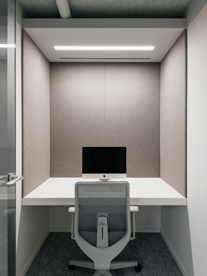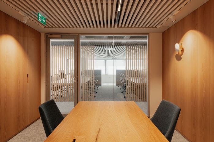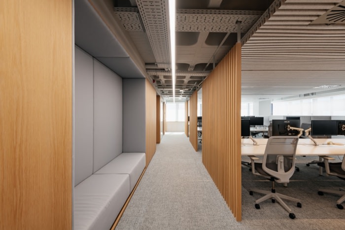 在低天花板空间引入必要的基础设施,并避免狭窄的区域。解决天花板高度和声学效果短的解决方案意味着在开放空间和办公室中使用毛毡板条,从而营造出半开放式天花板的印象。流通区的可见基础设施没有改变,为空间增添了非正式的感觉。新办公室采用舒适的材料和中性色调,橡木和灰色调的织物和涂料采用柔和的色调,增强了城市的光线和一览无余的景色。#专业办公室空间设计公司#