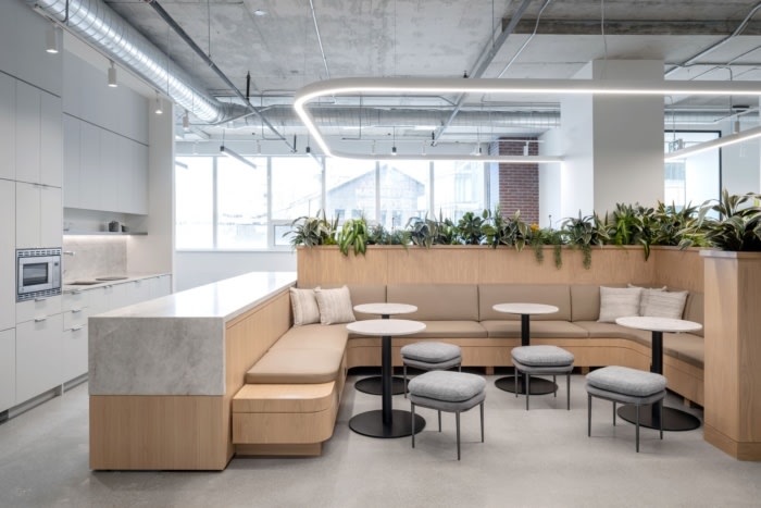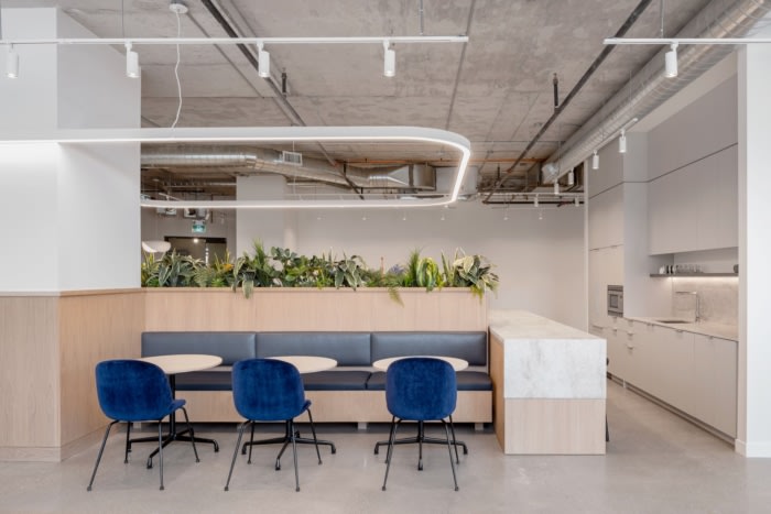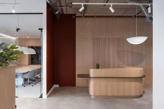 天然木饰面、板岩和大理石通过平衡阳光和保留标志性外观来装饰办公空间。办公室的东侧有一面深邃的酒红色墙壁,与周围环境形成鲜明对比。曲线贯穿始终 - 从您到达的那一刻起,并在由弧形镶板构成的定制前台迎接。它鼓舞人心,发人深省,是集思广益和深入讨论的理想空间,探索未来的意图和当下。#公司办公室设计效果图#