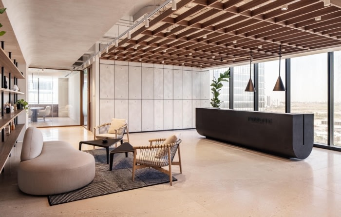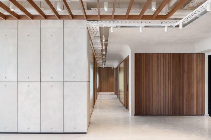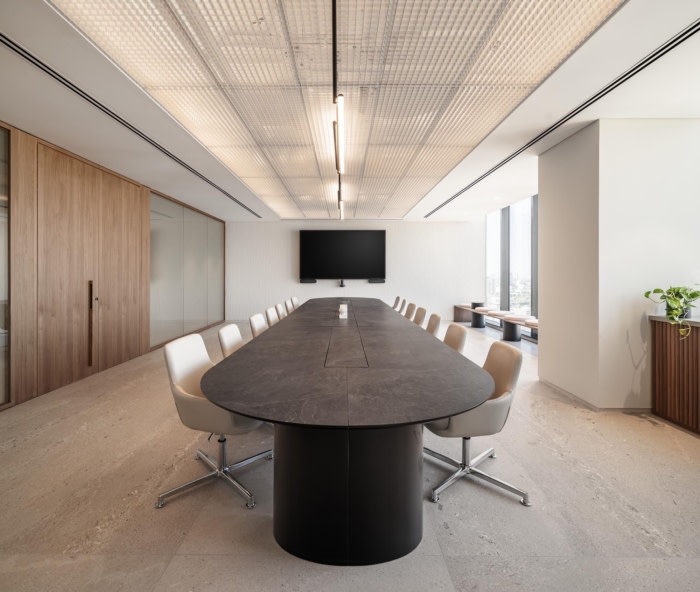 通过使用简洁的线条和精确而优雅的材料调色板,我们创造了一个传递权力和声誉的空间,同时又传递和谐、谦虚、亲密和温暖。该项目结合了各种独特的细节,如圆形天花板、隐藏式照明、定制木工细节、隐藏式门、网状天花板、胡桃木贴面隔板等。所有这些都源于项目的主要价值观:极简主义、几何、光影、真实性、形式和功能材料。#个性化办公室装修设计案例#