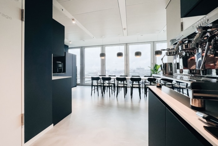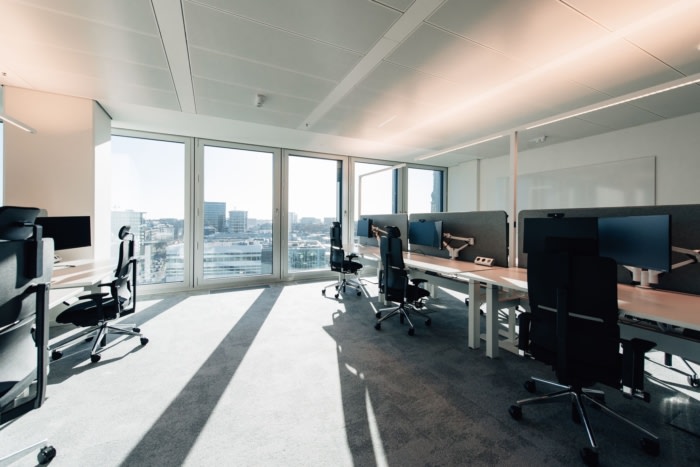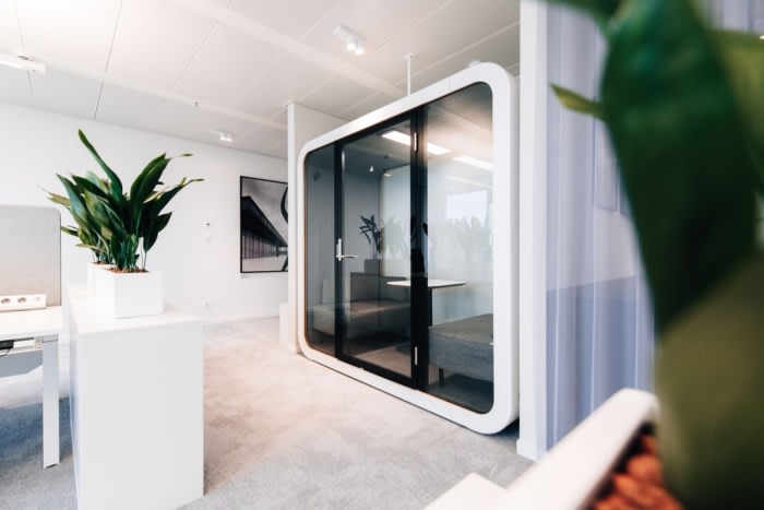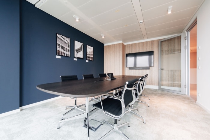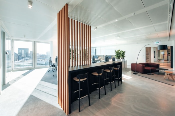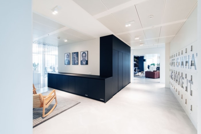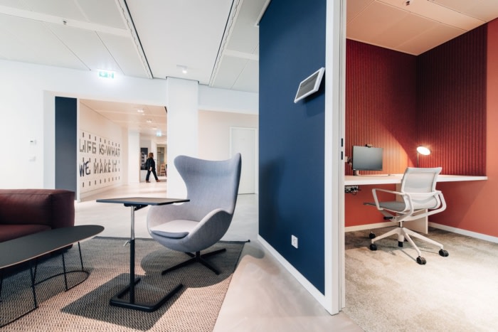清晰自然的色调与经典原色的刻意点缀相得益彰。重点是高品质、可持续的材料,这些材料经过精心组合和并置,以打破结构并增加视觉吸引力。这赋予了空间一种精致而温馨的风格。访客和员工通过由接待处、休息室和会议室组成的公共区域进入办公室,随后是带休息区、衣帽架和醒目品牌储物柜的半公共空间。#办公室室内设计公司#