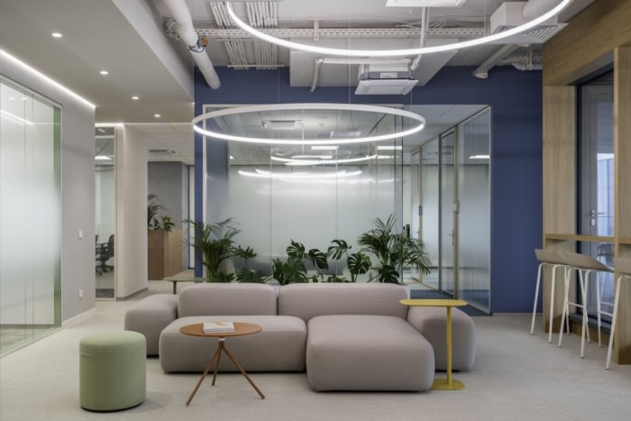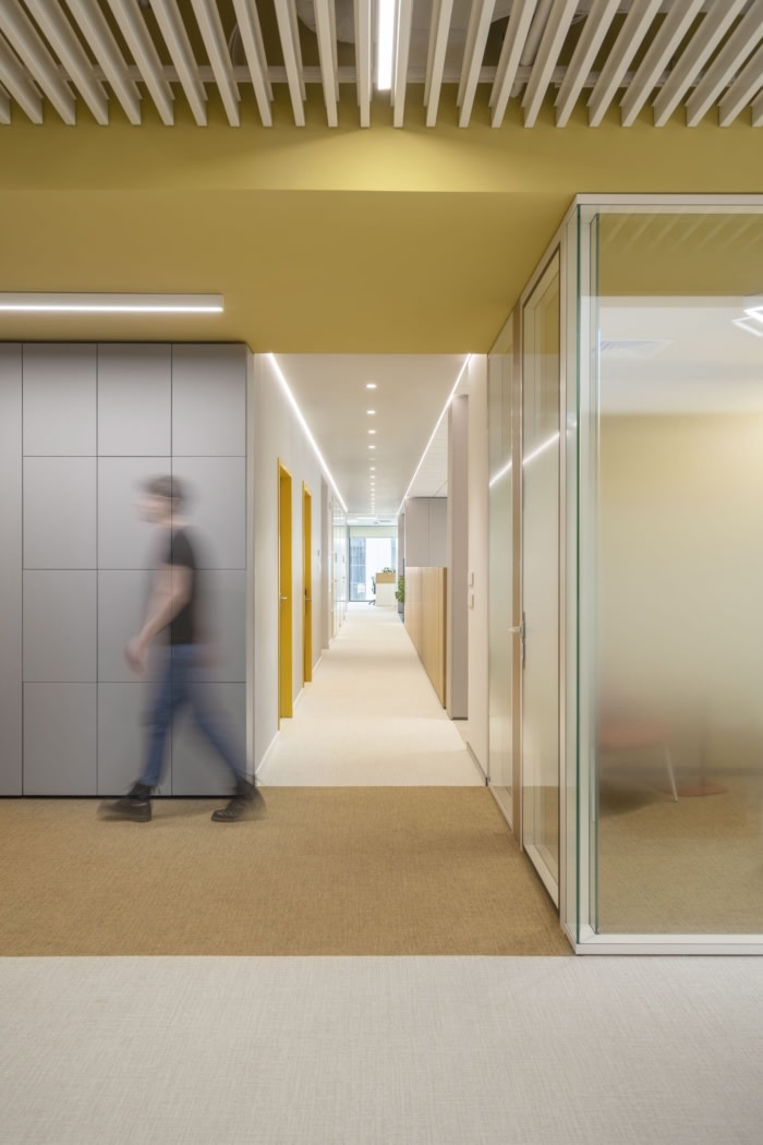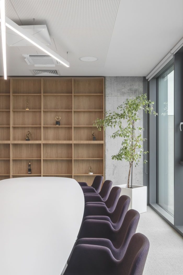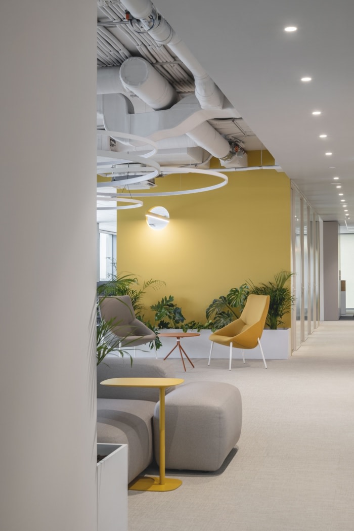 团体空间被精心地聚集在中央核心周围,而短期工作空间和电话亭则在中间找到了自己的位置,将过道与周边排列的工作站隔开,大部分自然光来自那里。公共空间战略性地位于接待区附近,主会议室就坐落在接待区后面。低矮的耳堂标志着中央过道的开始,该过道无缝连接所有区域。办公室充满活力的中心是一个半公共区域——一个装饰有软座椅的市政厅——提供与阳台和自助餐厅的连接,是聚会的理想场所。自助餐厅内的照明墙既可以作为照明源,也可以作为特殊场合的投影屏幕。#广州办公室装修设计公司排名#