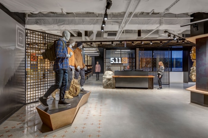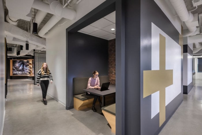 从员工和访客踏入总部的那一刻起,他们就被身临其境的品牌体验所笼罩。电梯大厅设有像素化的世界地图,该品牌标志性的“目标”图标标记了全球的办公和零售地点。这些图标是磁性的,可以随着企业的扩展灵活地添加更多位置。目标图标还被用作墙壁和地板上的寻路图形,以向该品牌的户外爱好者根源致敬。一块巨大的人造花岗岩巨石作为接待中心,突出了木材和钢制前台;一条走廊模仿了穿越峡谷的体验,贯穿整个办公室,将自然元素融入零售式环境中,展示他们的最新产品。#总部办公室设计#