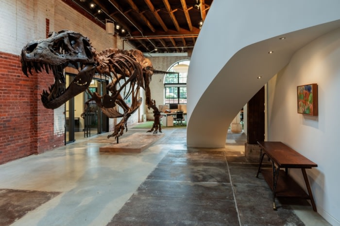 空间中央的绷紧的白色盒子容纳了办公室、会议室、厨房和浴室。设计师在地面上雕刻了体量,留下两个夹层,由中央中庭隔开??砝那吆颓阈钡那奖谖谱乓桓鲋型?,设计为狭缝峡谷的抽象,向空间之星的故乡致敬,这是霸王龙骨架的全尺寸复制品。#办公室装修案例#