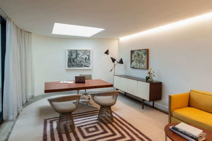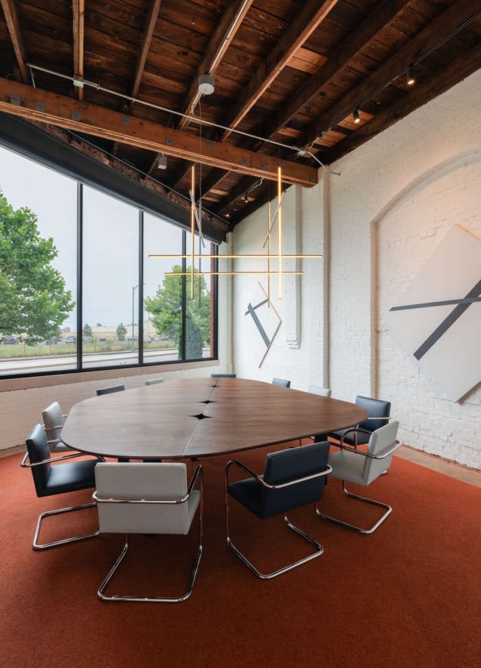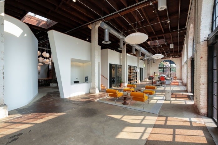 在现有木柱的网格后面,周围环绕着开放的拱形窗户。设计师对外壳没有隐瞒,在墙壁、地板和柱子上留下了多年积累的油漆和磨损。新建筑、清晰的建筑和现有建筑的古铜色之间的二分法突出了两者的优势。#办公室装修公司#