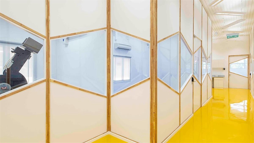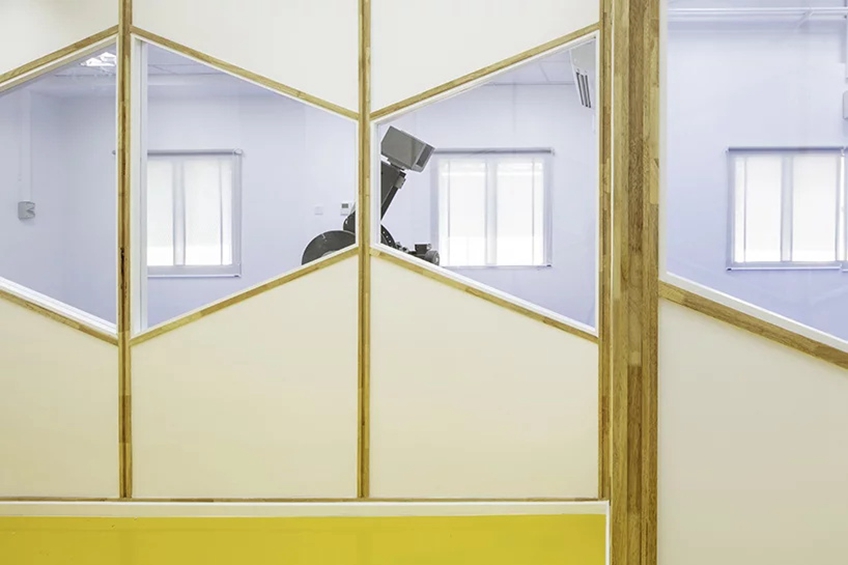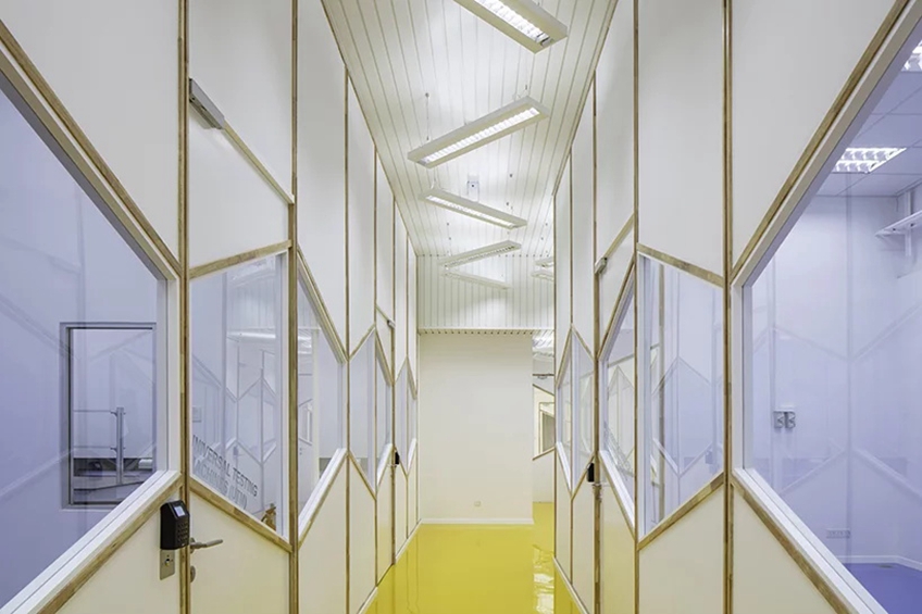 设计师想要创造一个充满活力和创造力的空间,这种环境其实对于研究是有利的,空间对人的心情有很大的影响,而心情在工作中往往很重要。玻璃面板沿着走廊的长度呈连续的条状排列,用活泼的倾斜线条打破单调,色彩也选择了温暖系的,条形窗户可以为实验室引进自然光线,明亮又绿色。