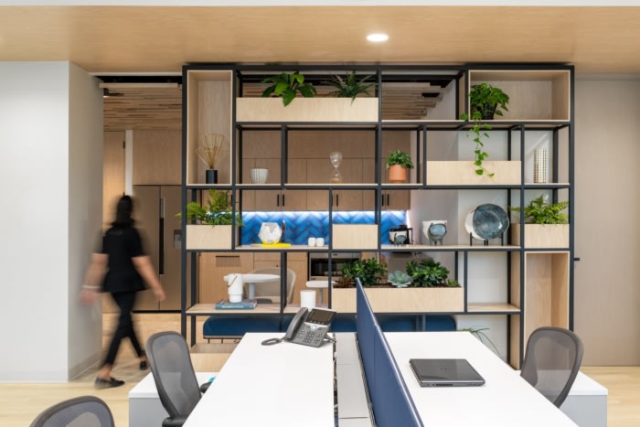 设计团队将办公室厨房重新构想为空间的公共中心,将原本孤立的实用区域转变为公司资产,鼓励轻松、互动的工作场所文化和频繁的协作。厨房和休息室区域具有独特的材料性,例如墨西哥蓝色瓷砖的后挡板和头顶上有节奏的木板条纹理,为办公室会议室中的板条设计增添了动感,感觉就像办公室内的绿洲。#办公室装修设计公司#