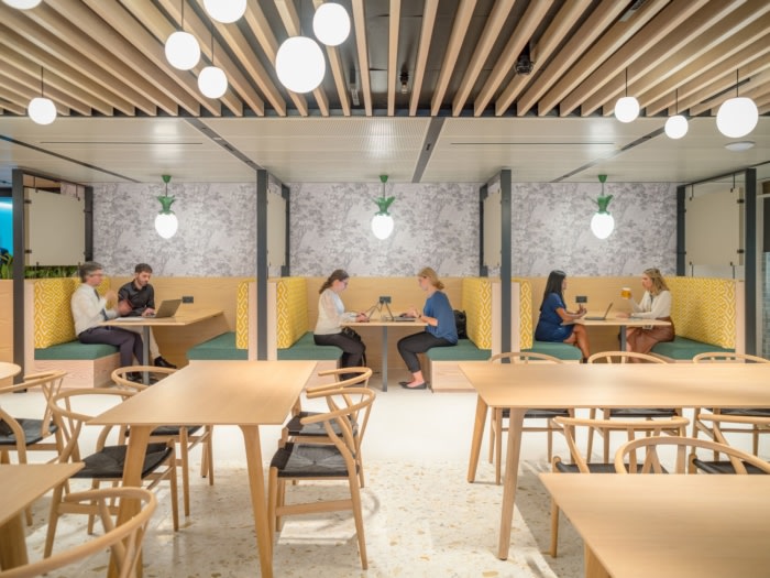在地下一层的员工咖啡厅,展位被重新装潢和搬迁,而现有的扶手椅和沙发则被搬迁到客户画廊。之前装修的书柜被重新利用,形成新接待处的背景,然后由会议室的细木工长凳补充,该长凳经过改造和重新装潢。在工作区中,所有茶点都配有现有的松散家具。最后,之前装修的工作椅也被重复使用,而所有现有的办公桌都捐赠给了慈善机构和学校。#办公楼设计装修公司#